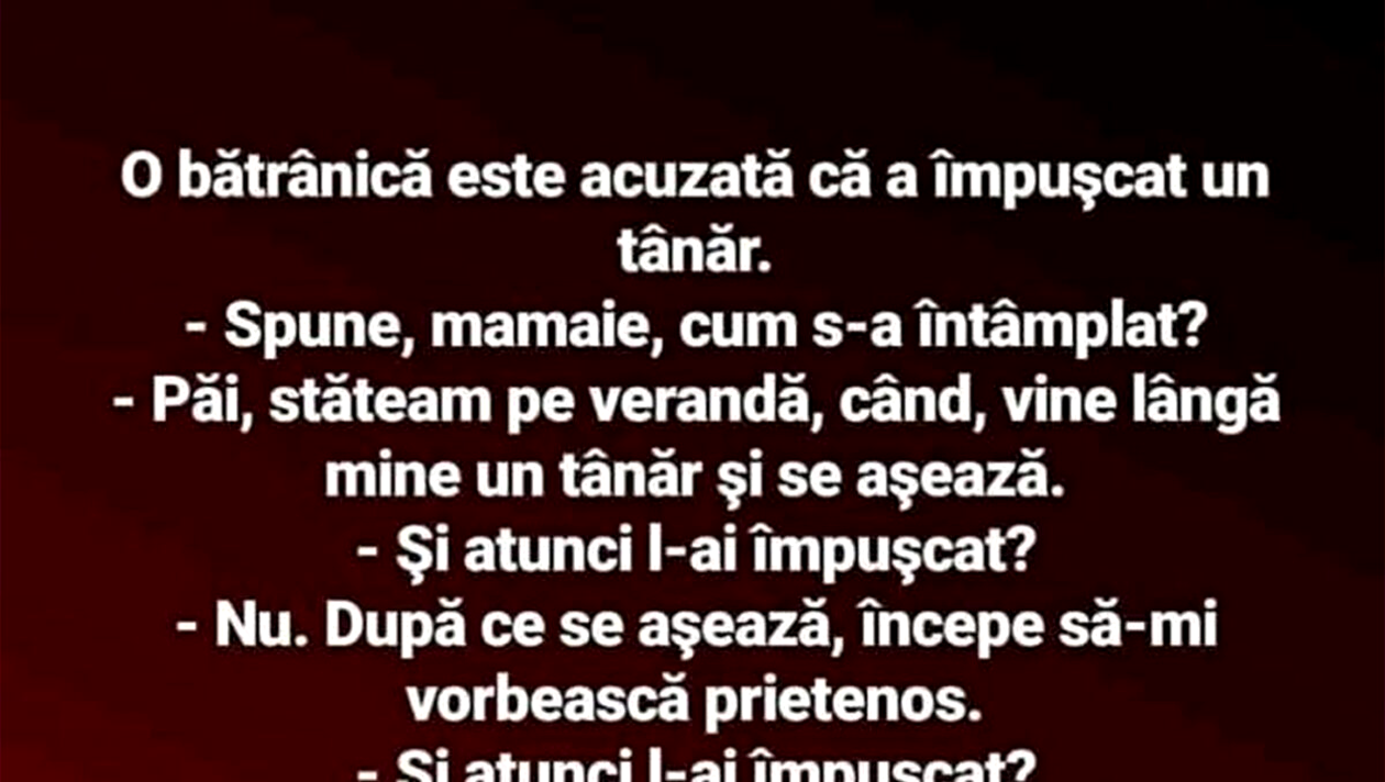 – Spune, mamaie, cum s-a întâmplat? – Păi, stăteam pe verandă, când vine lângă mine un tânăr şi se aşează.