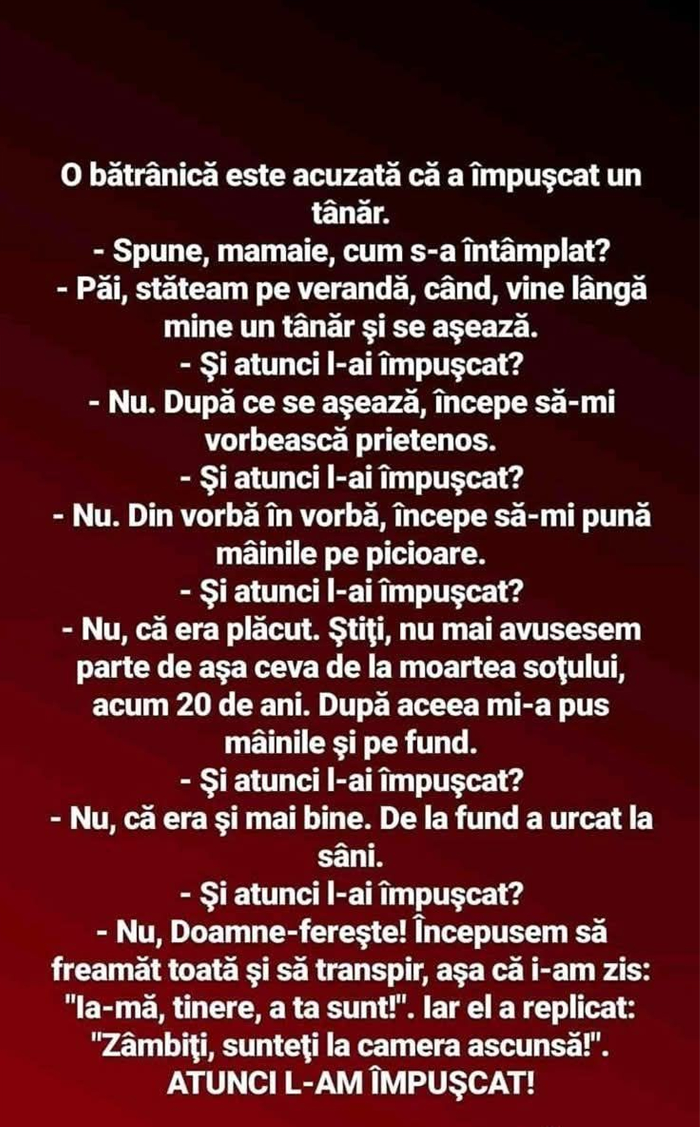 – Nu, Doamne-fereşte! Începusem să freamăt toată şi să transpir, aşa că i-am zis: „Ia-mă, tinere, a ta sunt!”. Iar el a replicat: „Zâmbiţi, sunteți la camera ascunsă!”. ATUNCI L-AM ÎMPUŞCAT!