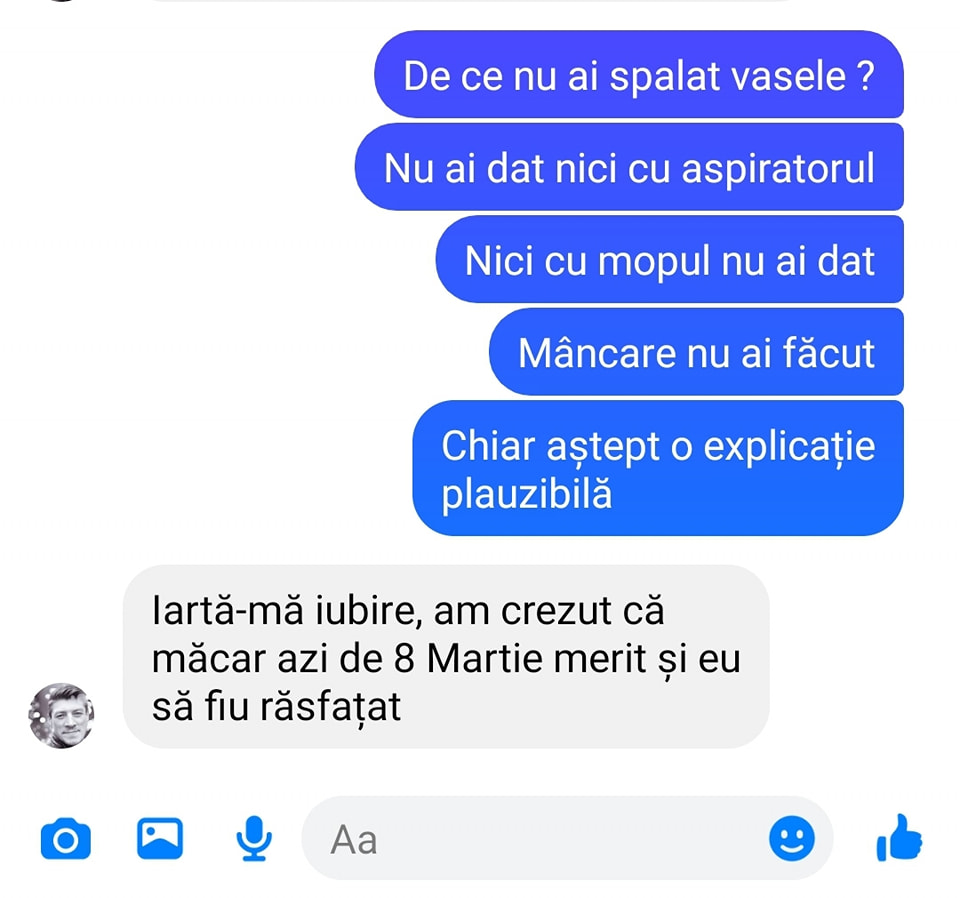 -Iartă-mă iubire, am crezut că măcar azi de 8 Martie merit și eu să fiu răsfățat”.