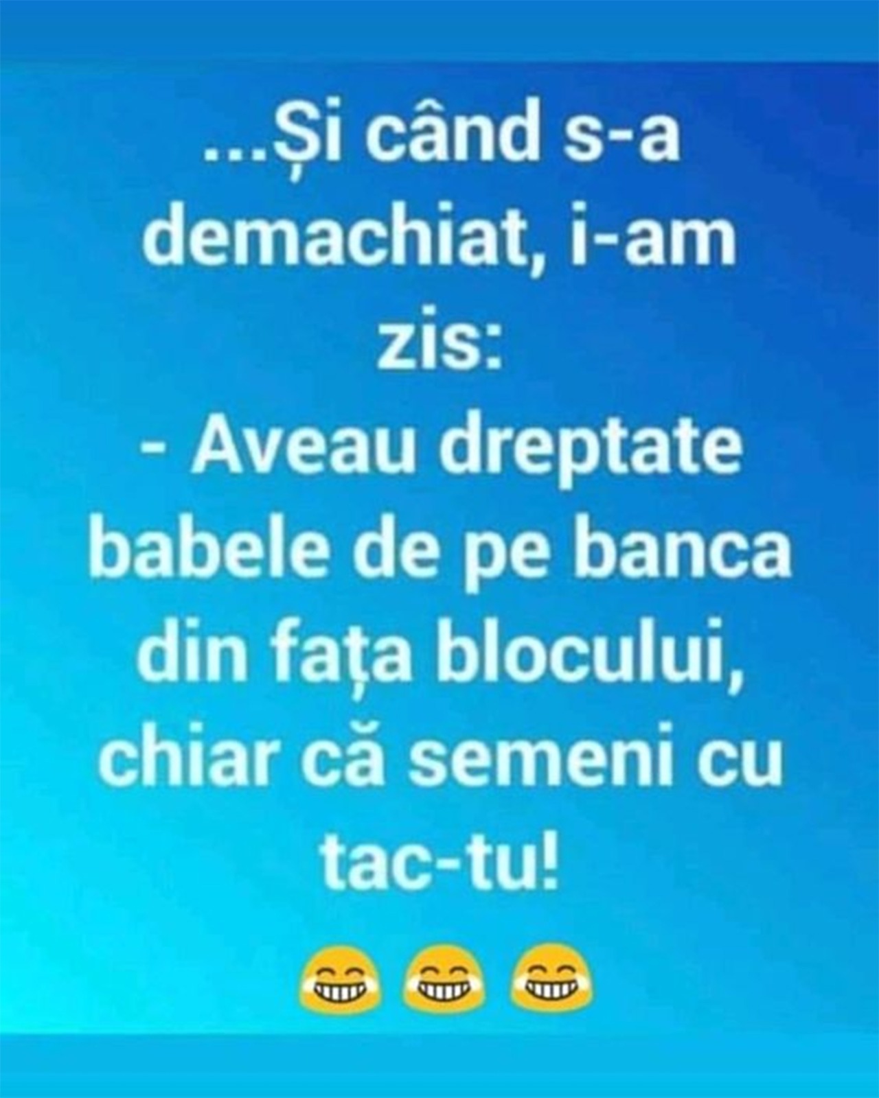– Și când s-a demachiat, i-am zis: ”Aveau dreptate babele de pe banca din fața blocului, chiar că semeni cu tac-tu!”