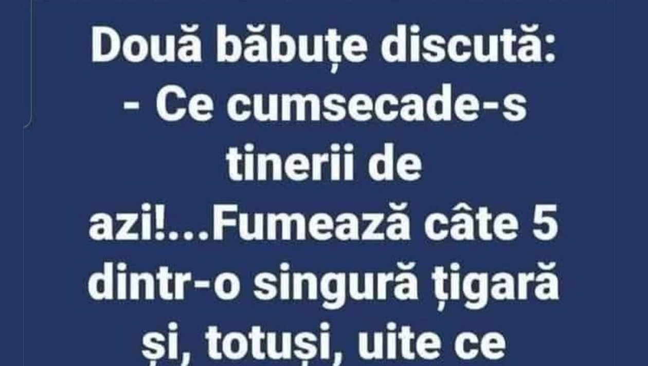 – Ce cumsecade-s tinerii de azi! Fumează câte 5 dintr-o singură țigară și, totuși, uite ce fericiți sunt!