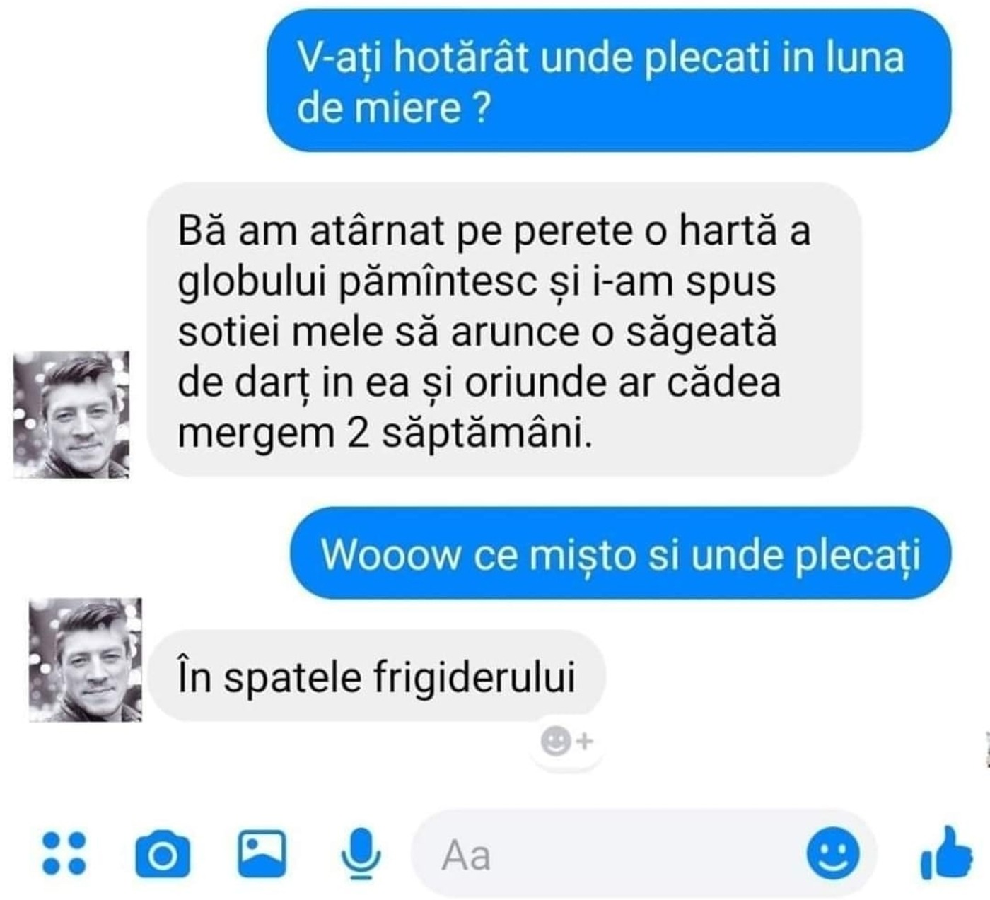 -Bă am atârnat pe perete o hartă a globului pământesc și i-am spus soției mele să arunce o săgeată de darț în ea și oriunde ar cădea mergem două săptămâni.
