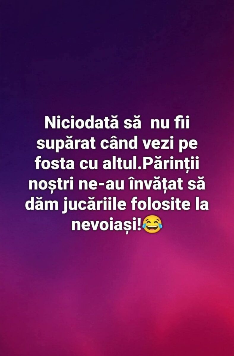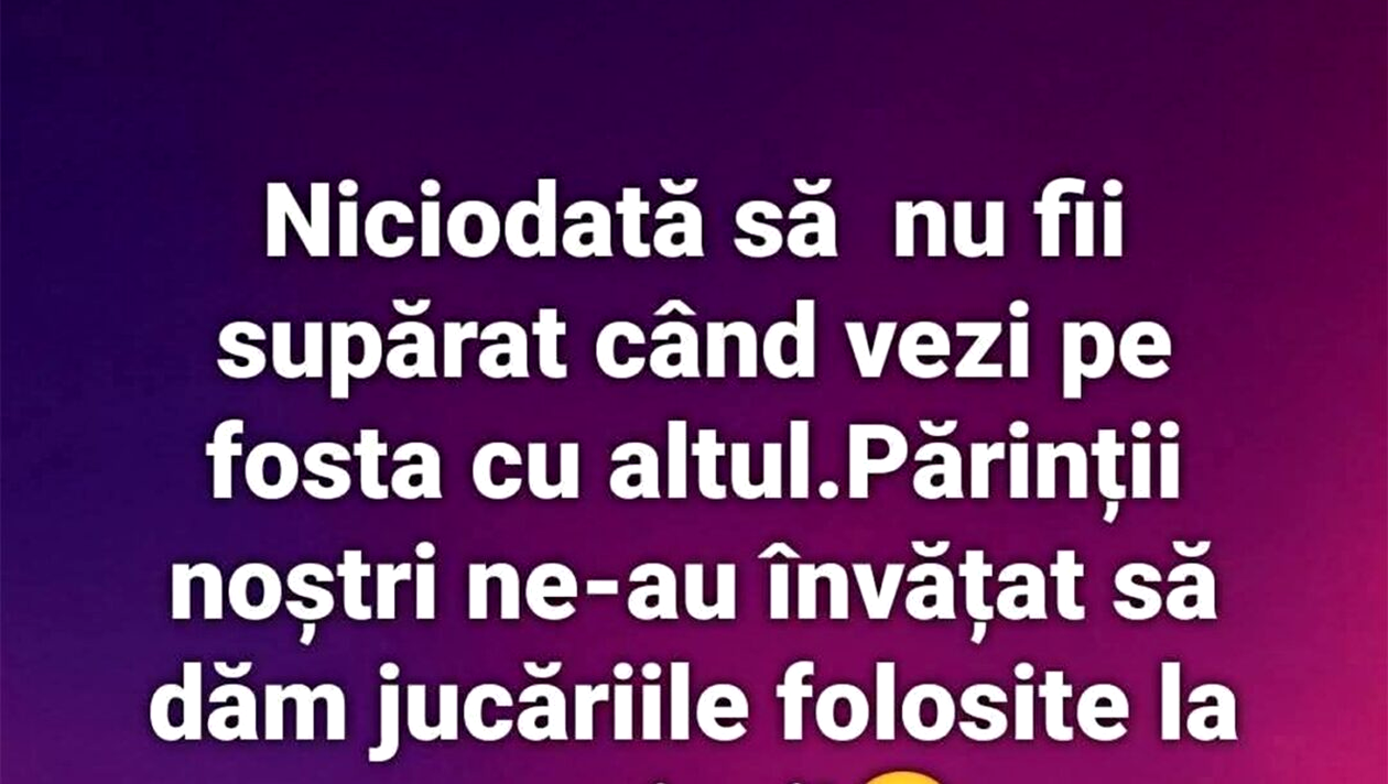 Niciodată să nu fii supărat când îți vezi fosta cu altul. Părinții ne-au învățat să le dăm nevoiașilor jucăriile folosite.