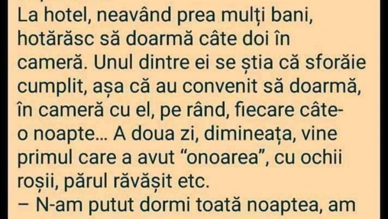 Patru prieteni își petrec vacanța împreună. La hotel, neavând prea mulți bani, hotărăsc să doarmă câte doi în cameră. Unul dintre ei se știa că sforăie cumplit, așa că au convenit să doarmă în cameră cu el, pe rând, fiecare câte-o noapte. A doua zi, dimineața, vine primul care a avut „onoarea”, cu ochii roșii, părul răvășit etc.