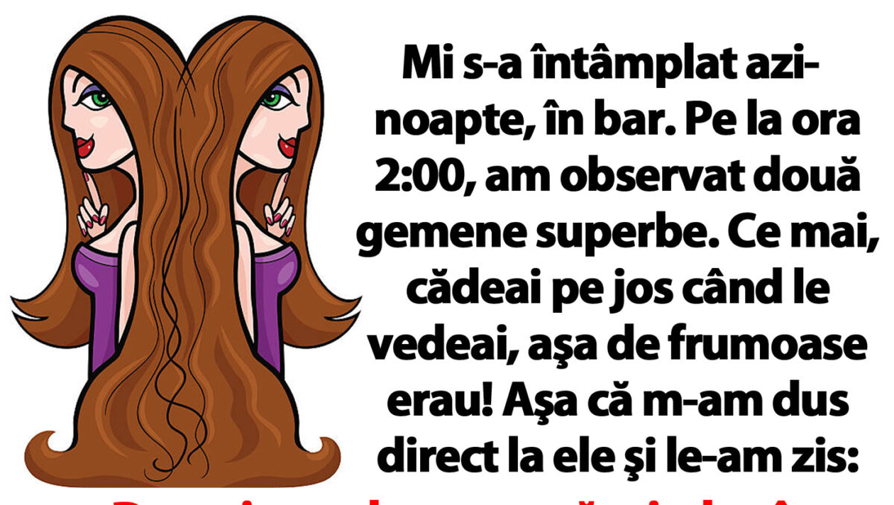 Mi s-a întâmplat azi-noapte, în bar. Pe la ora 2:00, am observat două gemene superbe. Ce mai, cădeai pe jos când le vedeai, aşa de frumoase erau! Aşa că m-am dus direct la ele şi le-am zis: