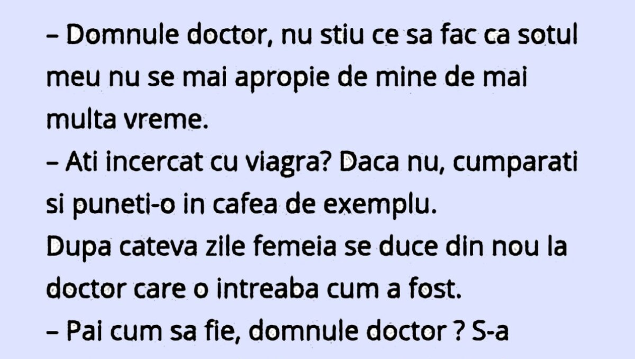 – Domnule doctor, nu știu ce să fac pentru că soțul meu nu se mai apropie de mine de mai multă vreme.