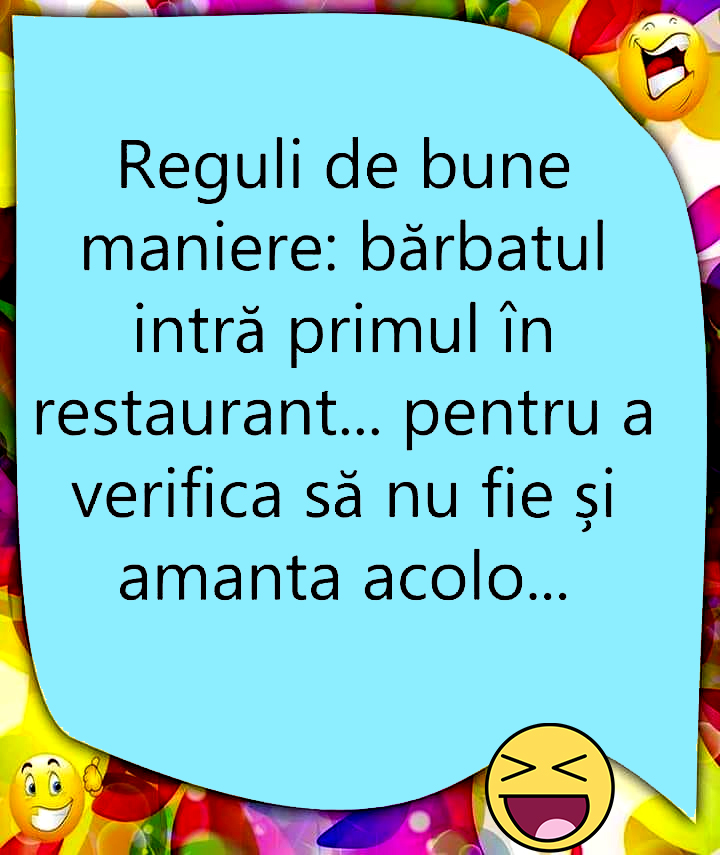 Bancul de weekend. Este vineri, motiv pentru care vă încântăm cu o serie de bancuri care să vă aducă zâmbetele pe buze. Voi știați care sunt regulile de bune maniere… pentru bărbați? Odată ce veți afla, sigur o să vă „smulgă” un chicot sau un zâmbet. Spor la râs, dragi cititori!