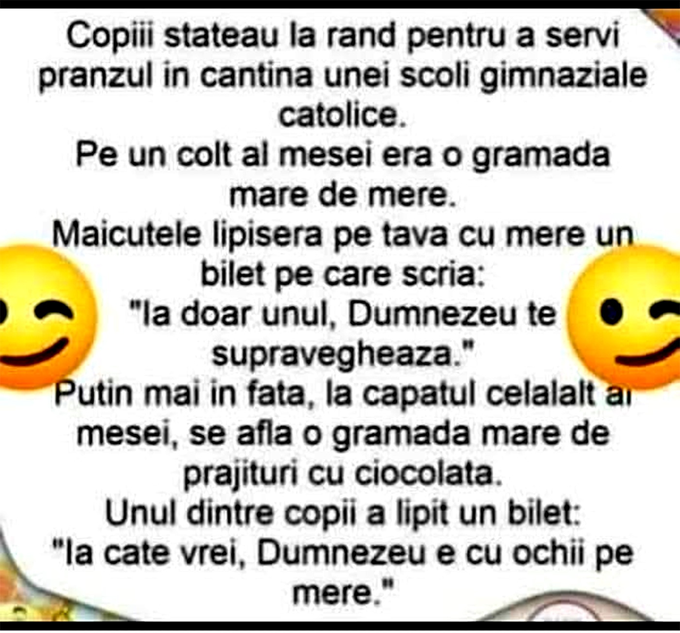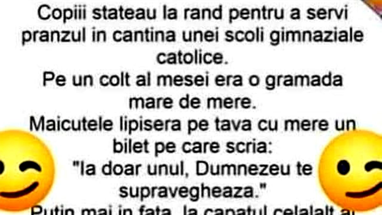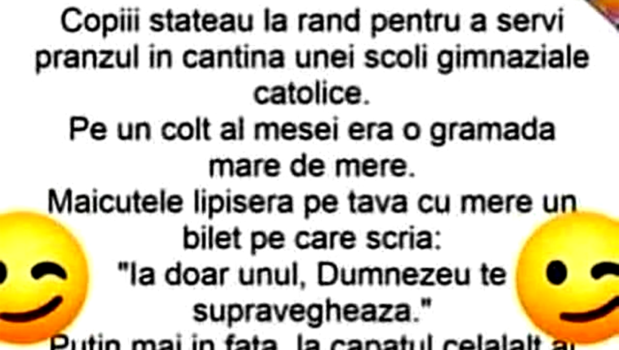 Copiii stăteau la rând pentru a servi prânzul în cantina unei școli gimnaziale catolice. Pe un colț al mesei era o grămadă mare de mere. Măicuțele lipiseră pe tava cu mere un bilet pe care scria: ”Ia doar unul, Dumnezeu te supraveghează”.