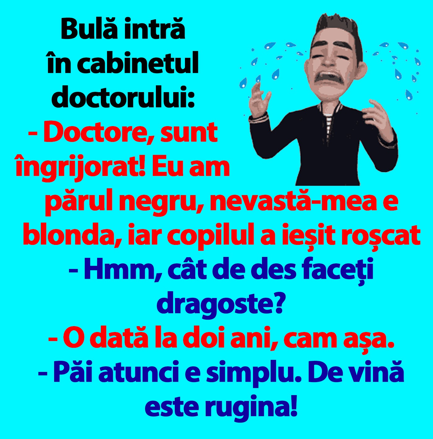 – Doctore, sunt îngrijorat! Eu am părul negru, nevastă-mea e blonda, iar copilul a ieșit roșcat.