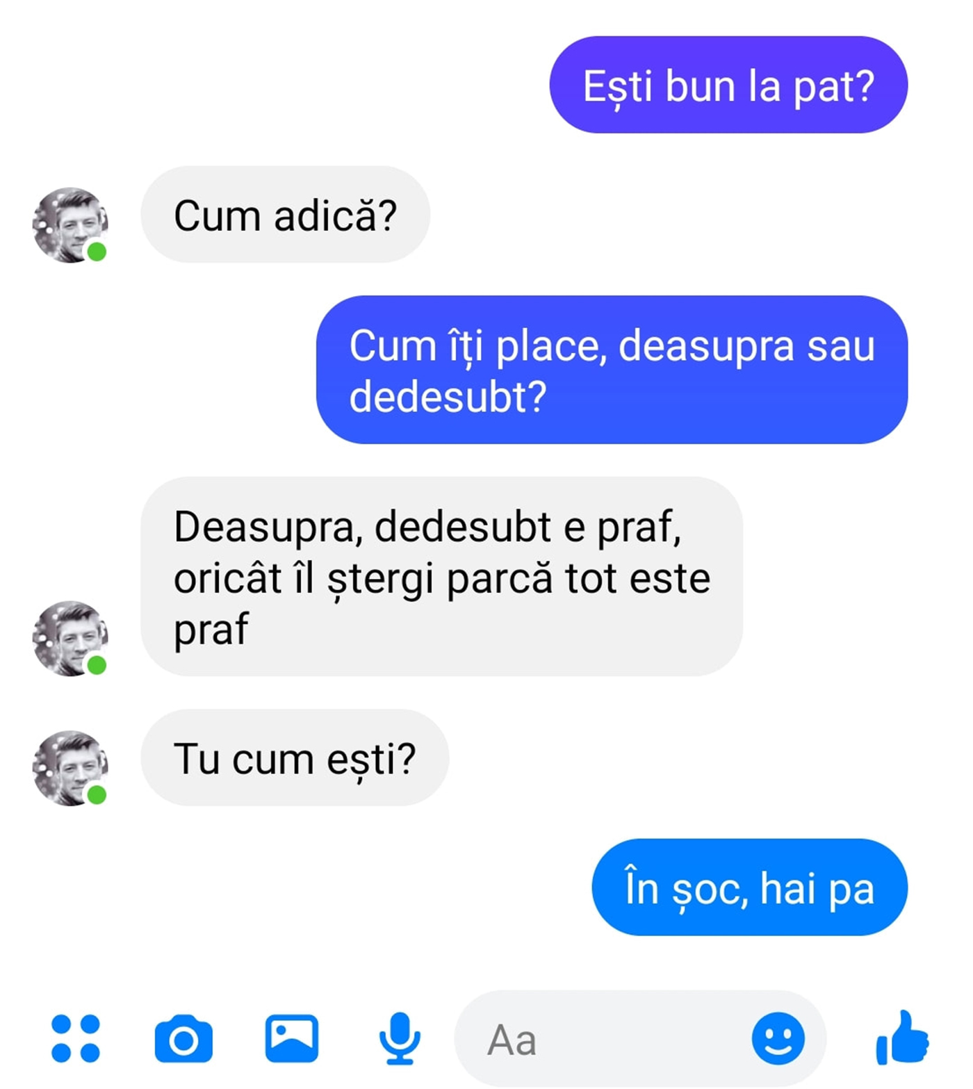 -Deasupra, dedesubt e praf, oricât îl ștergi parcă tot este praf. Tu cum ești?