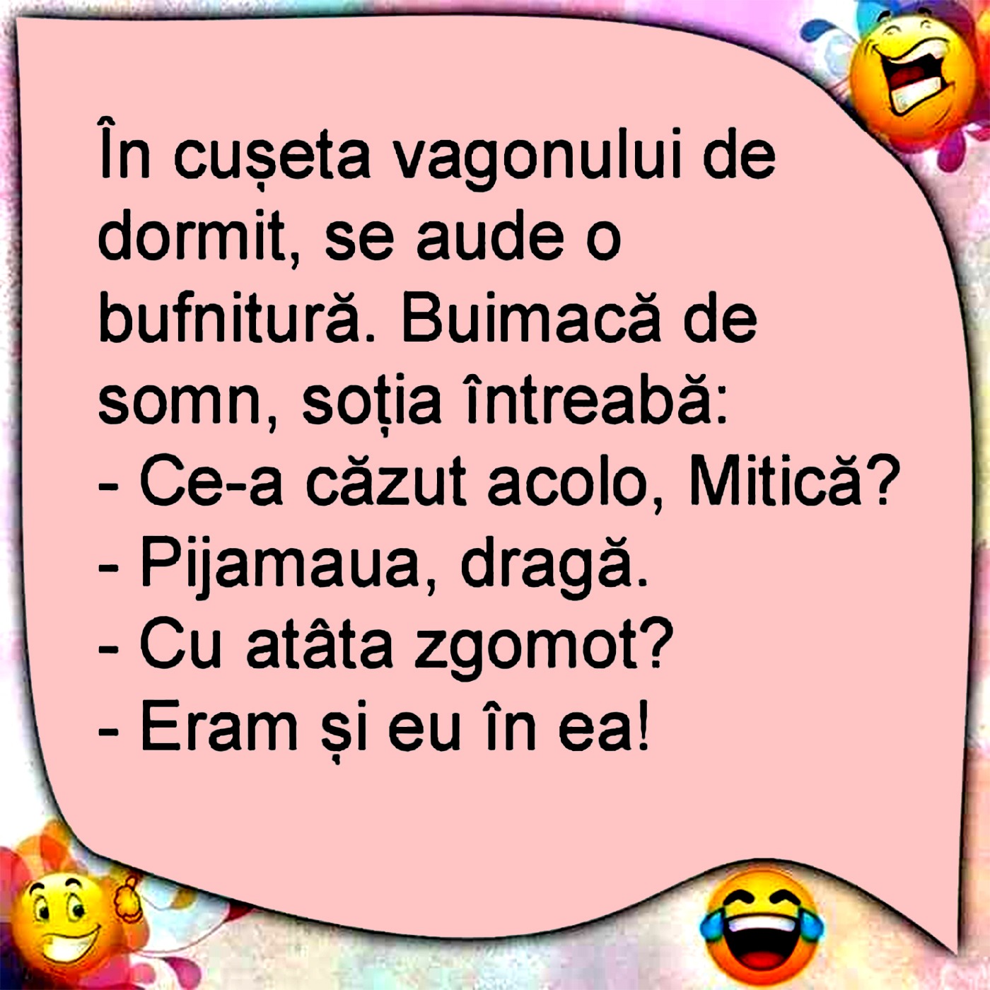 Nu trebuie să tracă nicio zi fără o porție copioasă de râs, iar pentru asta am pregătit un banc care cu siguranță o să te amuze copios. Protagoniștii de astăzi sunt Mitică și soția sa. Cei doi călătoresc cu trenul, iar deznodământul este hilar.