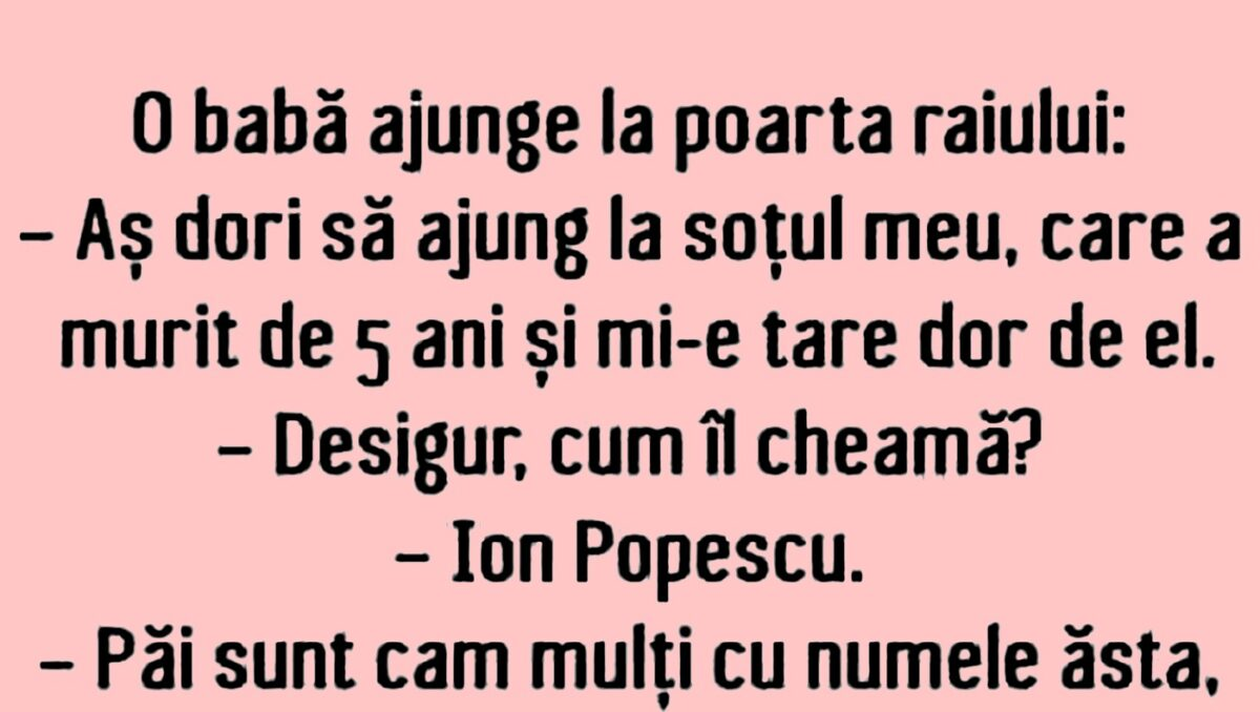 Nu trebuie să treacă nicio zi fără o porție copioasă de râs, iar pentru asta am pregătit un banc care cu siguranță o să te amuze copios. Protagonista de azi este o bătrână care ajunge în Rai și încearcă să își găsească soțul. Deznodământul este hilar.
