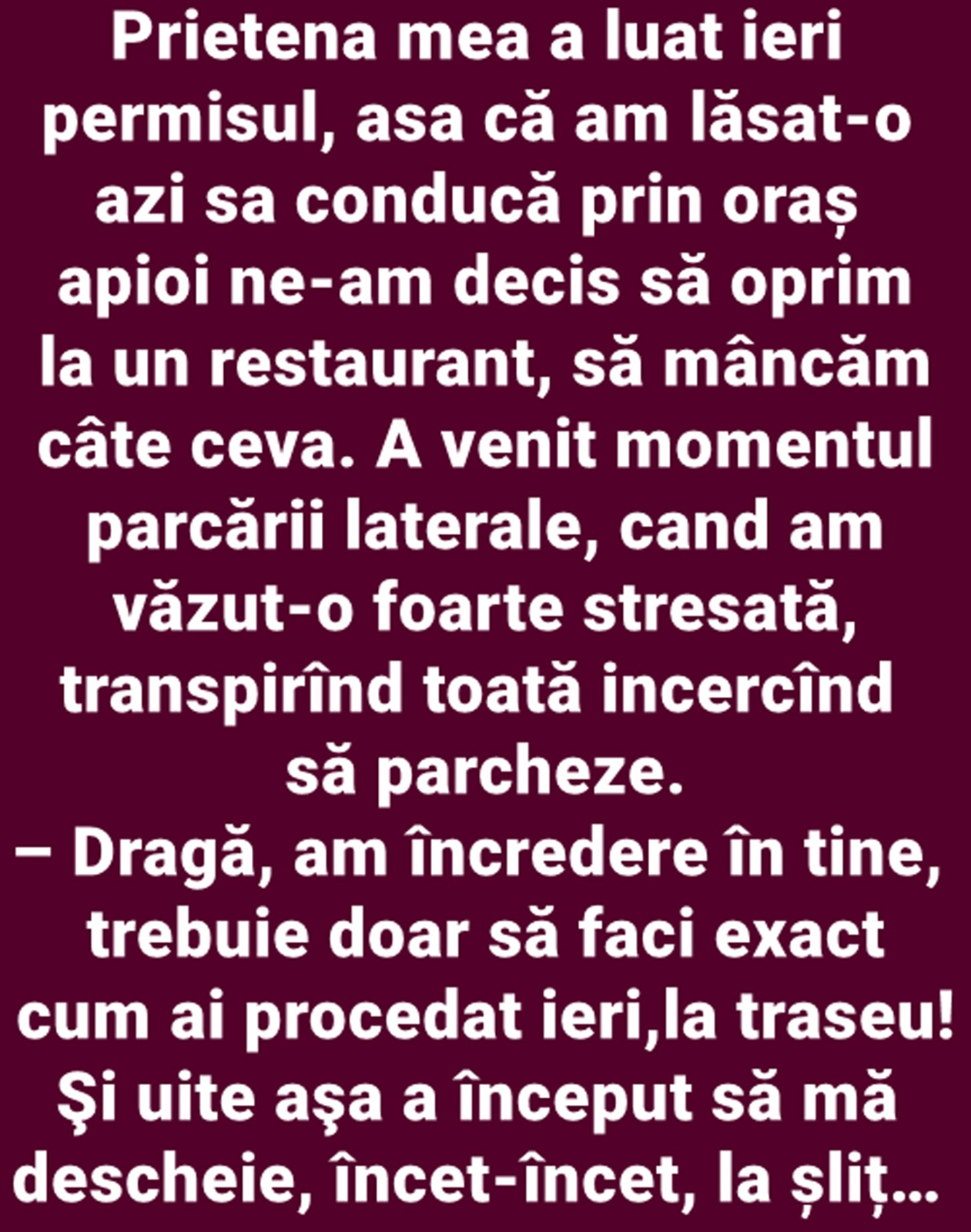 „Prietena mea a luat ieri permisul, așa că am lăsat-o azi să conducă prin oraș apoi ne-am decis să oprim la un restaurant, să mâncăm câte ceva. A venit momentul parcării laterale, când am văzut-o foarte stresată, transpirând toată încercând să parcheze.