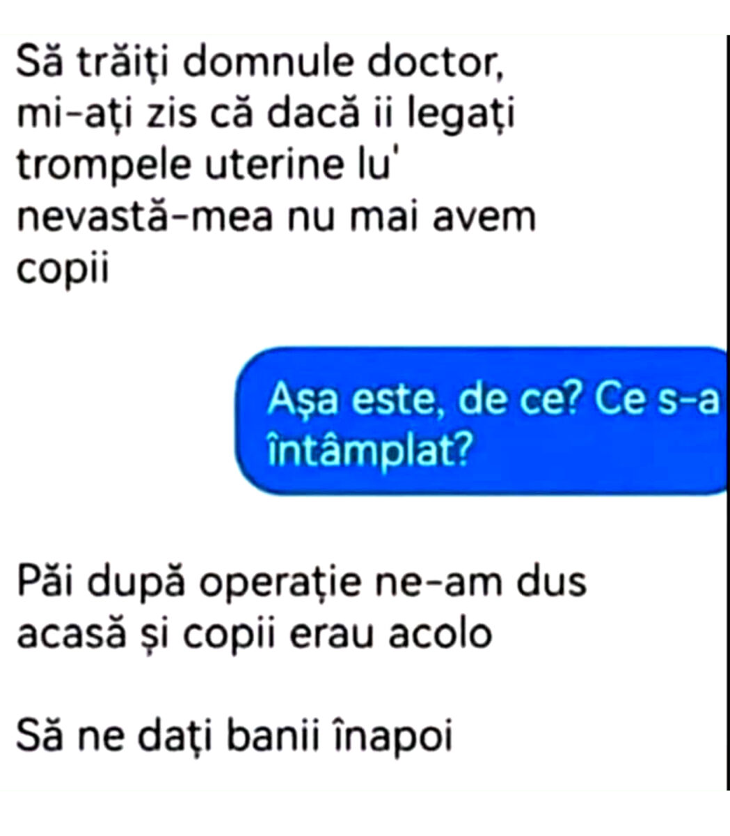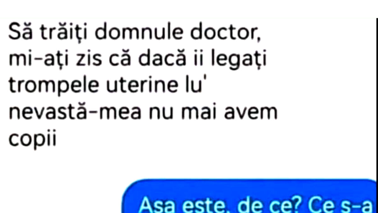 – Să trăiți, domnule doctor, mi-ați zis că dacă îi legați trompele uterine lu’ nevastă-mea nu mai avem copii.