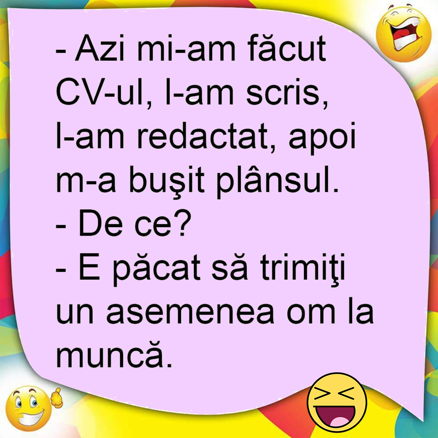 Dragi cititori, CANCAN.RO v-a pregătit un banc amuzant, pentru această după amiază de sâmbătă. Conversația dintre două persoane în care una dintre ele ajunge să își redacteze CV-ul este de-a dreptul savuroasă.