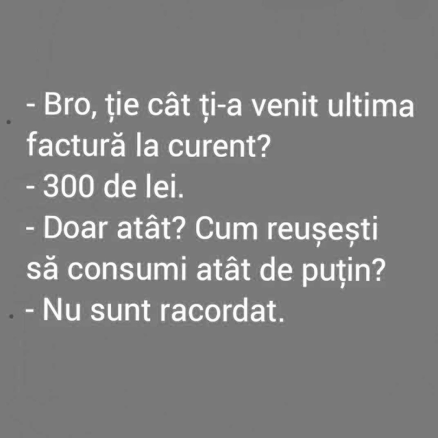 – Bro, ție cât ți-a venit ultima factură la curent?