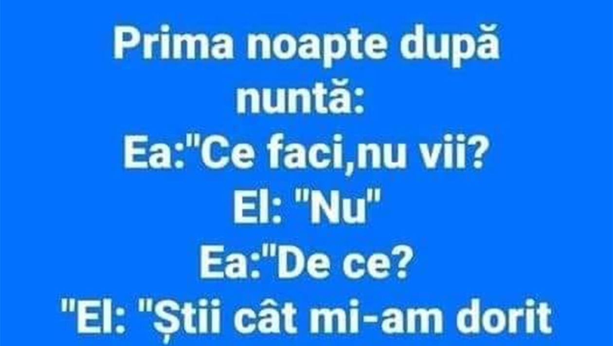 Și, pentru că e sâmbătă seară și trebuie să ne relaxăm corect și corespunzător la finalul săptămânii, echipa CANCAN.ro are pentru voi un nou banc! De data asta, ne amuzăm pe seama unui cuplu de tineri căsătoriți. Ea e nerăbdătoare să își petreacă nopțile cu soțul ei, iar el… Eh, vă lăsăm pe voi să descoperiți în rândurile de mai jos!