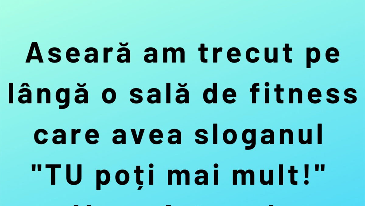 ”Aseară am trecut pe lângă o sală de fitness care avea sloganul: ”TU poți mai mult!”. M-am întors la cârciumă și am mai băut 5 beri”, este bancul zilei.