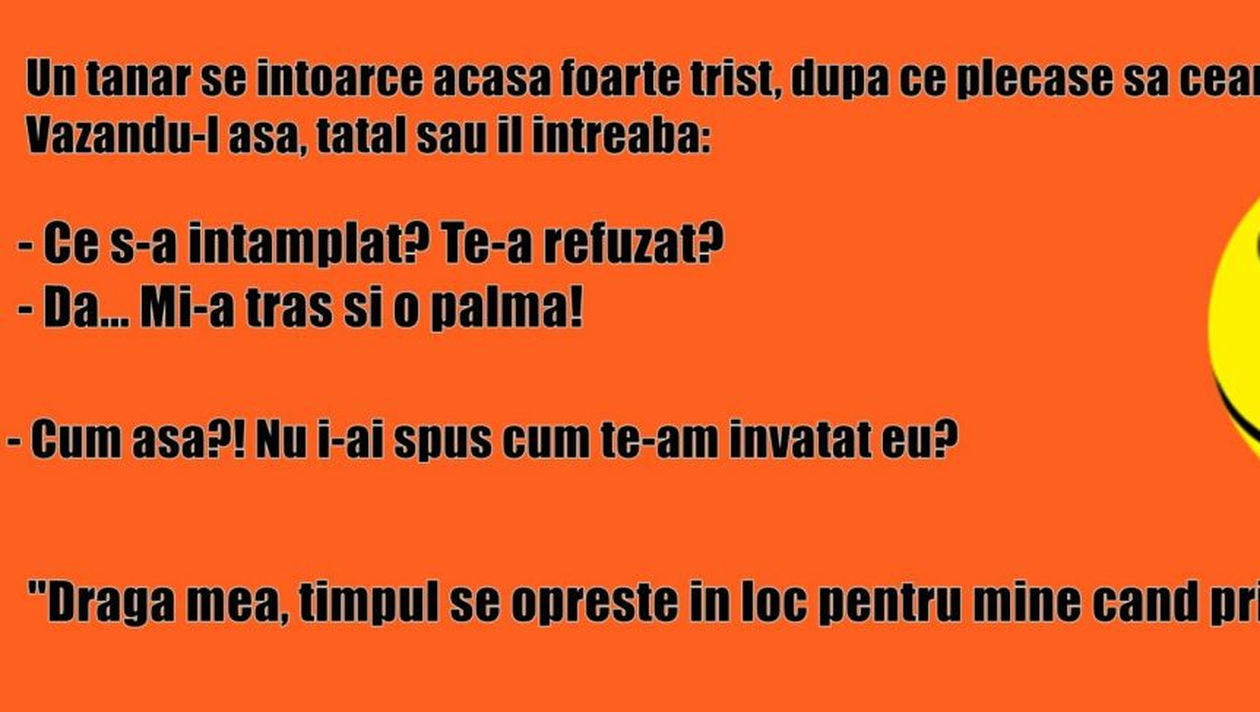 Bancul zilei. Un tânăr își face curaj și o cere pe iubita lui în căsătorie. Însă, se întoarce acasă, abătut, iar tatăl lui l-a întrebat ce s-a întâmplat. Dialogul stârnește amuzament! Spor la râs!
