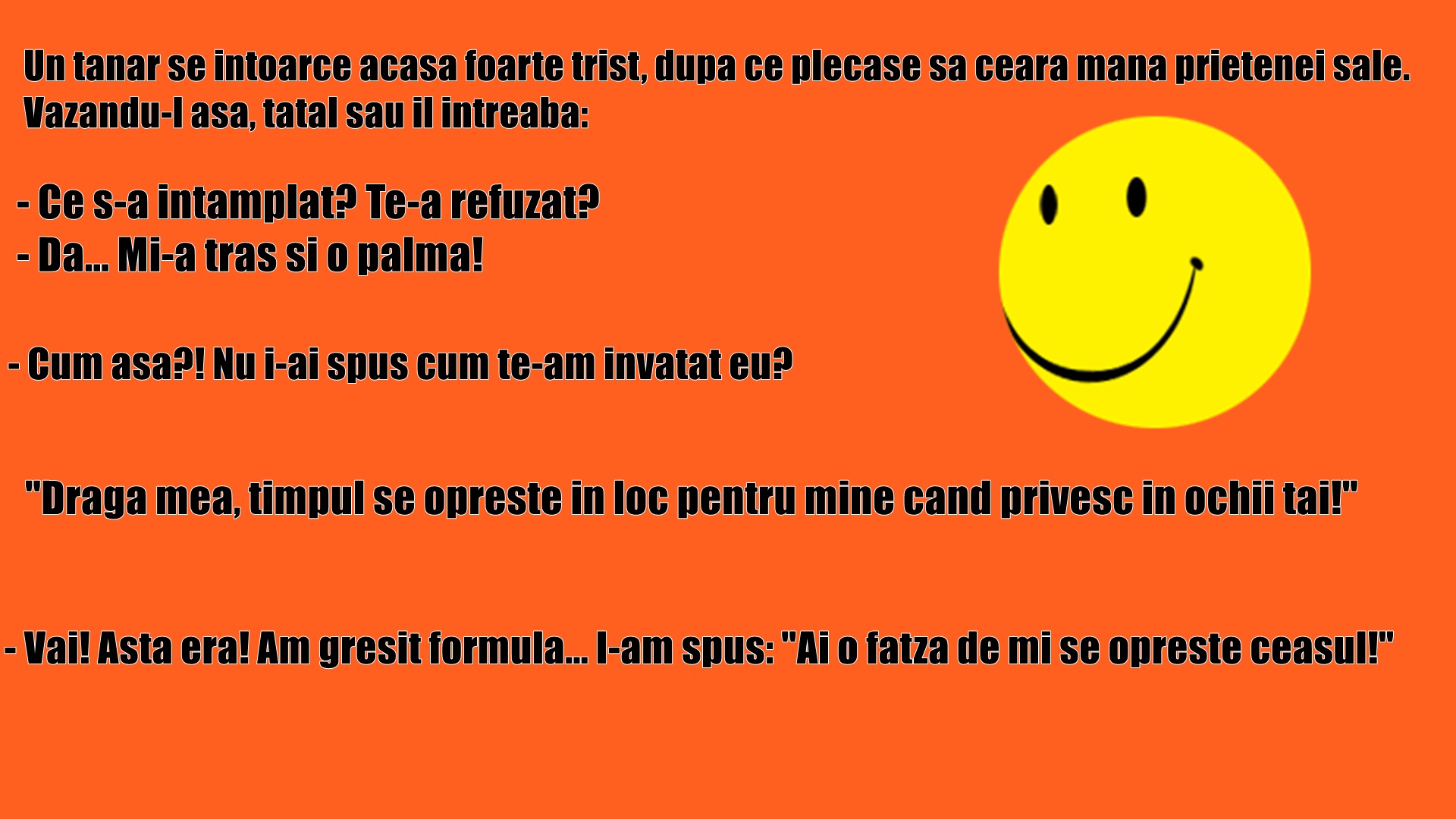 – Cum așa?! Nu i-ai spus cum te-am învățat eu? – „Draga mea, timpul se oprește în loc pentru mine când privesc în ochii tăi!”
