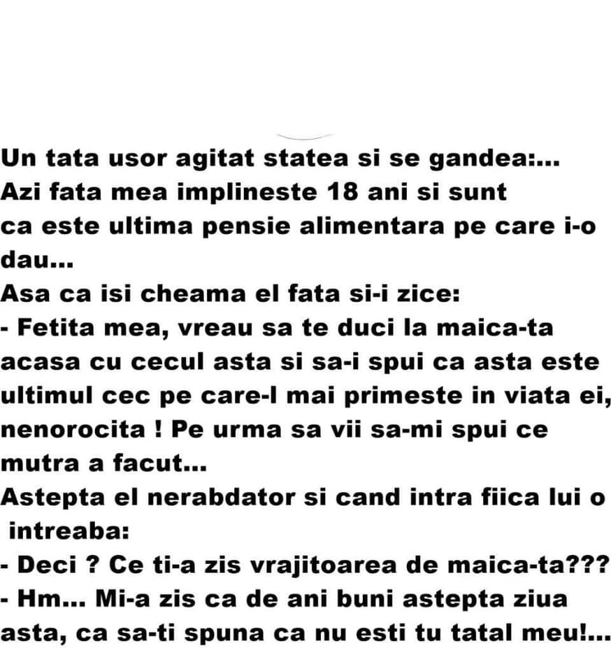 – Fetița mea, vreau să te duci la maică-ta acasă cu cecul ăsta și să-i spui că ăsta este ultimul cec pe care-l mai primește în viața ei, nenorocita! Pe urmă să vii să-mi spui ce mutră a făcut…