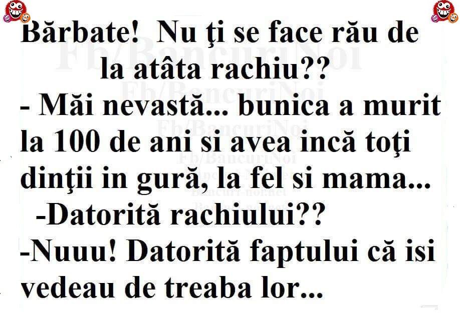-Măi nevastă… bunica a murit la 100 de ani și avea încă toți dinții în gură, la fel și mama…