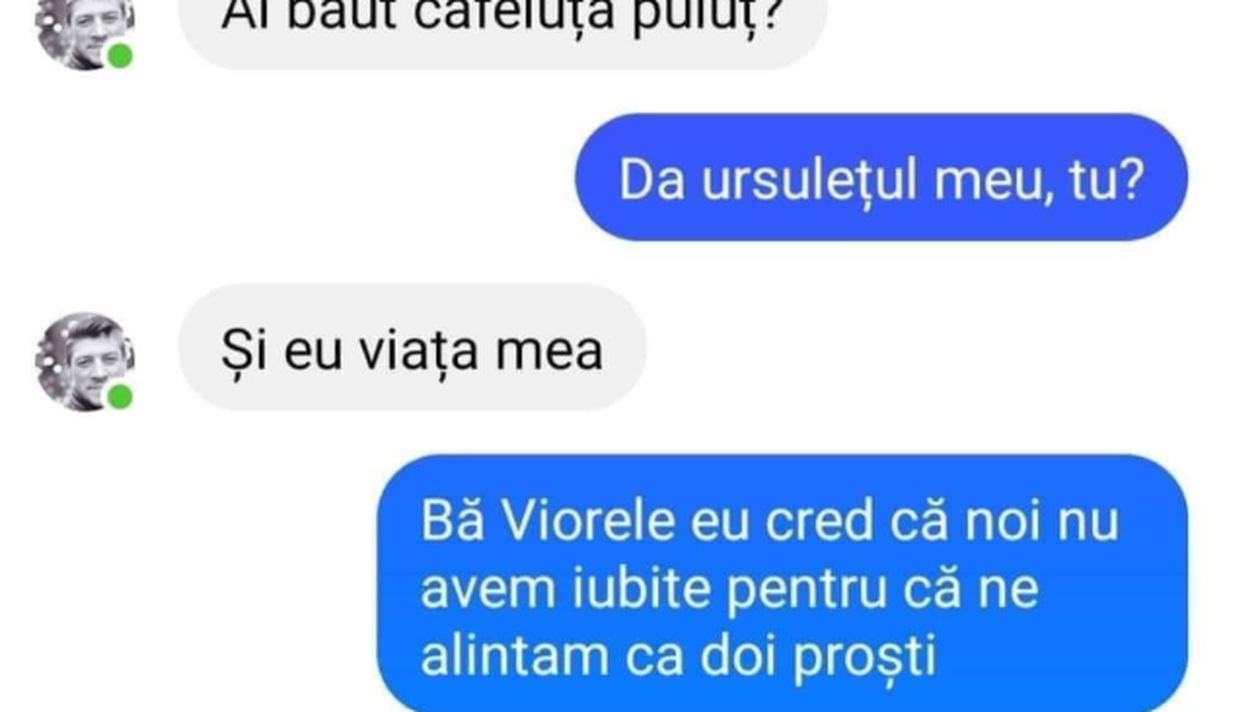 – Bă, Viorele, eu cred că noi nu avem iubite pentru că ne alintăm ca doi proști.