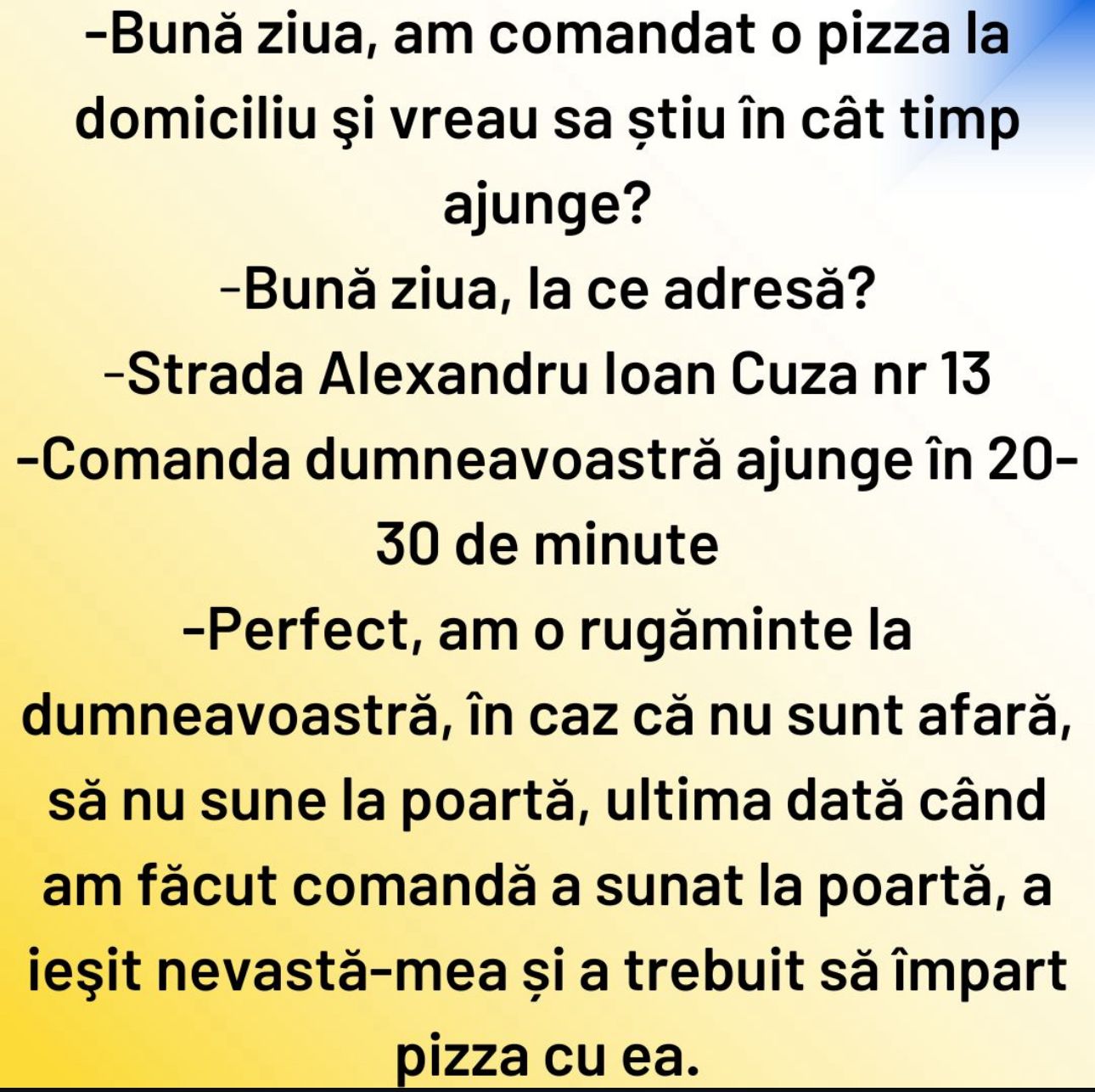 – Perfect, am o rugăminte la dumneavoastră, în caz că nu sunt afară, să nu sune la poartă. Ultima dată când am făcut comandă a sunat la poartă, a ieșit nevastă-mea și a trebuit să împart pizza cu ea.