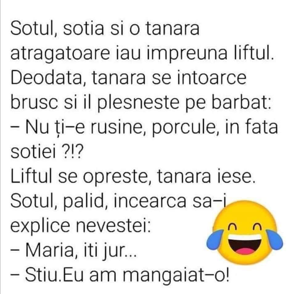 Protagoniștii zilei de astăzi: doi soți. Aceștia se aflau în scara blocului în care locuiau și așteptau să coboare liftul. Imediat, lângă cei doi și-a făcut apariția și o tânără atrăgătoare.