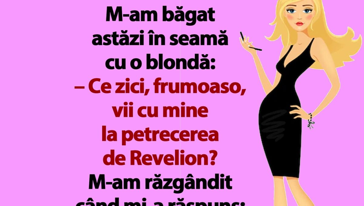 CANCAN.RO ți-a pregătit un banc amuzant, special pentru a marca, cum se cuvine, încheierea anului 2022. Ce i-a răspuns o blondă unui bărbat, în momentul în care i-a propus să meargă împreună la petrecerea de Revelion.