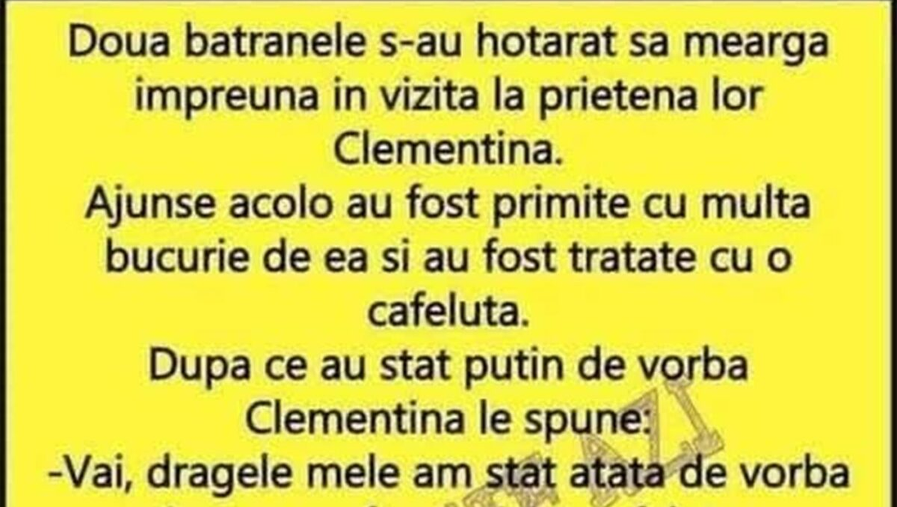 Două bătrânele s-au hotărât să meargă împreună în vizită la prietena lor Clementina. Ajunse acolo au fost primite cu multă bucurie de ea și au fost tratate cu o cafeluță. După ce au stat puțin de vorbă Clementina le spune: