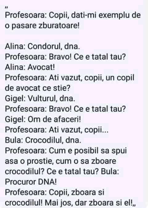 Profesoara: Cum e posibil să spui așa o prostie, cum o să zboare crocodilul? Ce e tatăl tău?