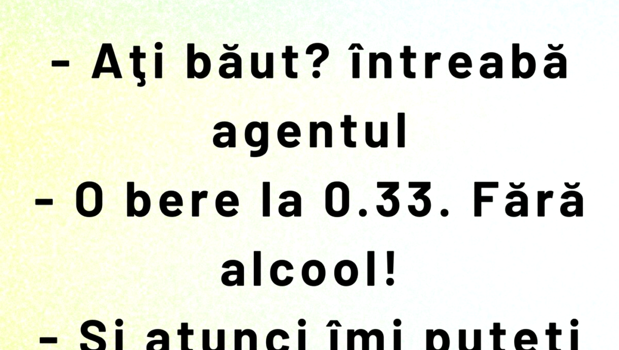 CANCAN.RO ți-a pregătit bancul zilei de sâmbătă. Ești pregătit să râzi cum nu ai mai făcut-o de mult timp? Dacă da, discuția dintre un agent de poliție și un șofer beat îți va aduce zâmbetul pe buze.