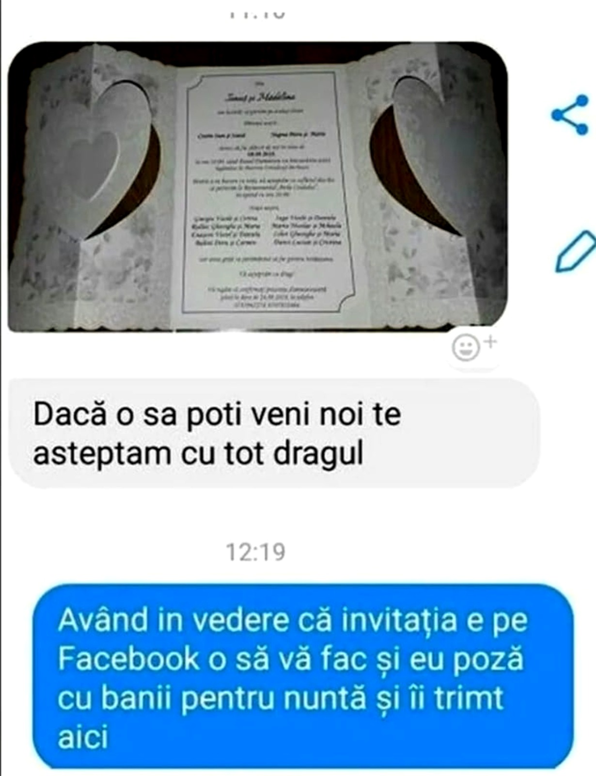 -Având în vedere faptul că invitația e pe Facebook, o să fac și eu o poză cu banii pentru nuntă și îți trimit aici”.