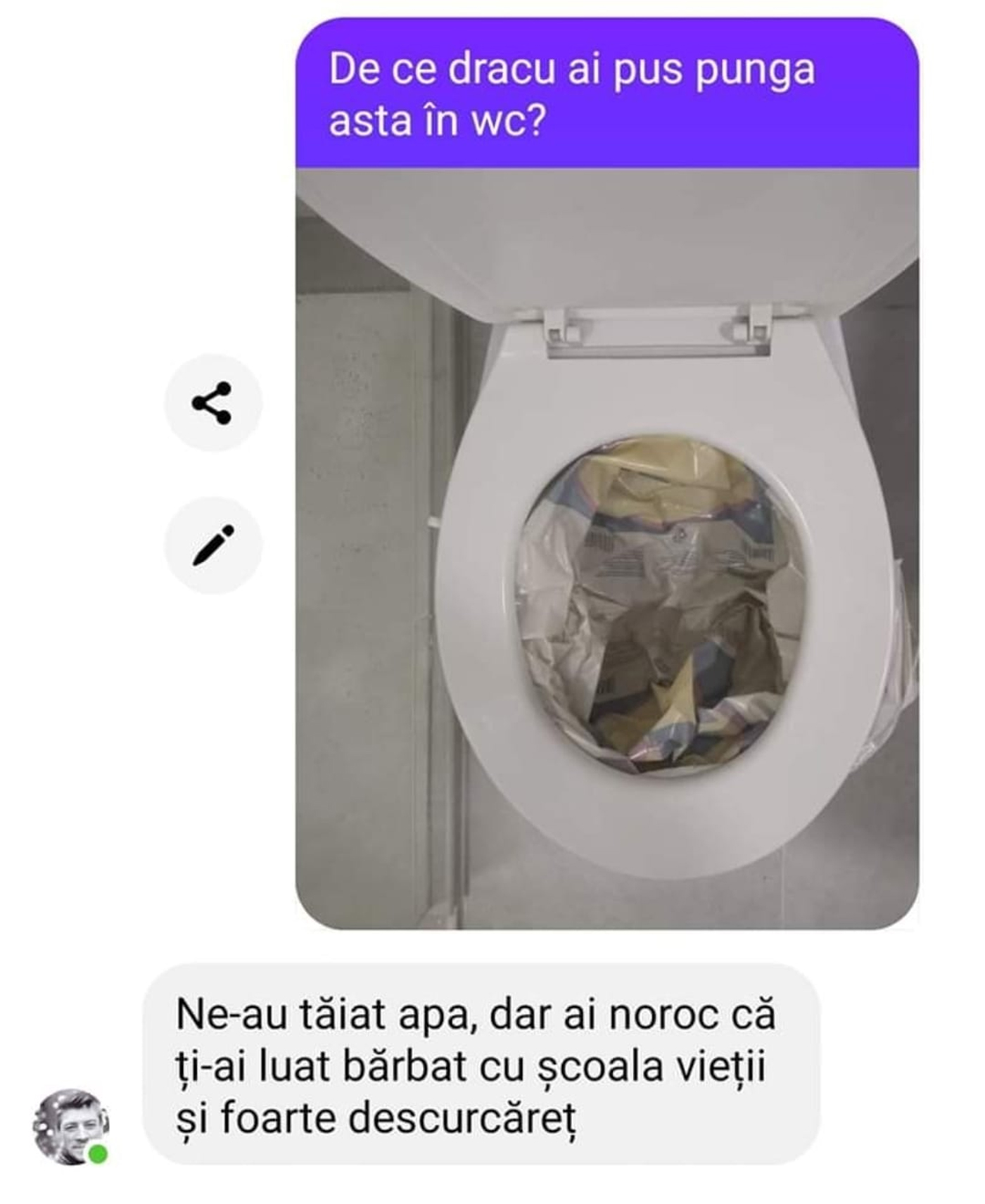 „-De ce dracu’ ai pus punga asta în WC?