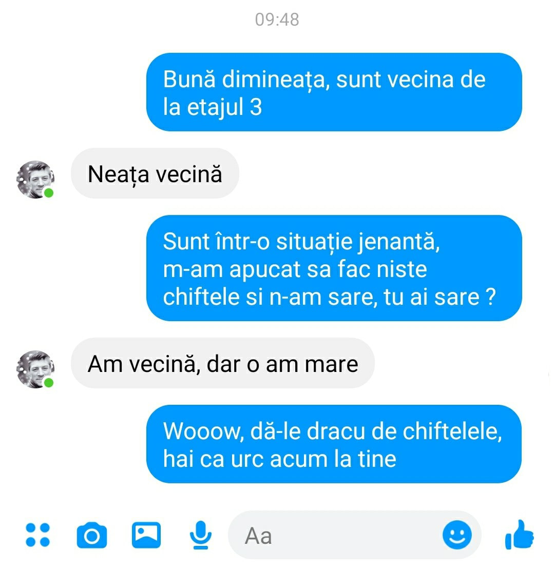 – Sunt într-o situație jenantă, m-am apucat să fac niște chiftele și n-am sare, tu ai sare?
