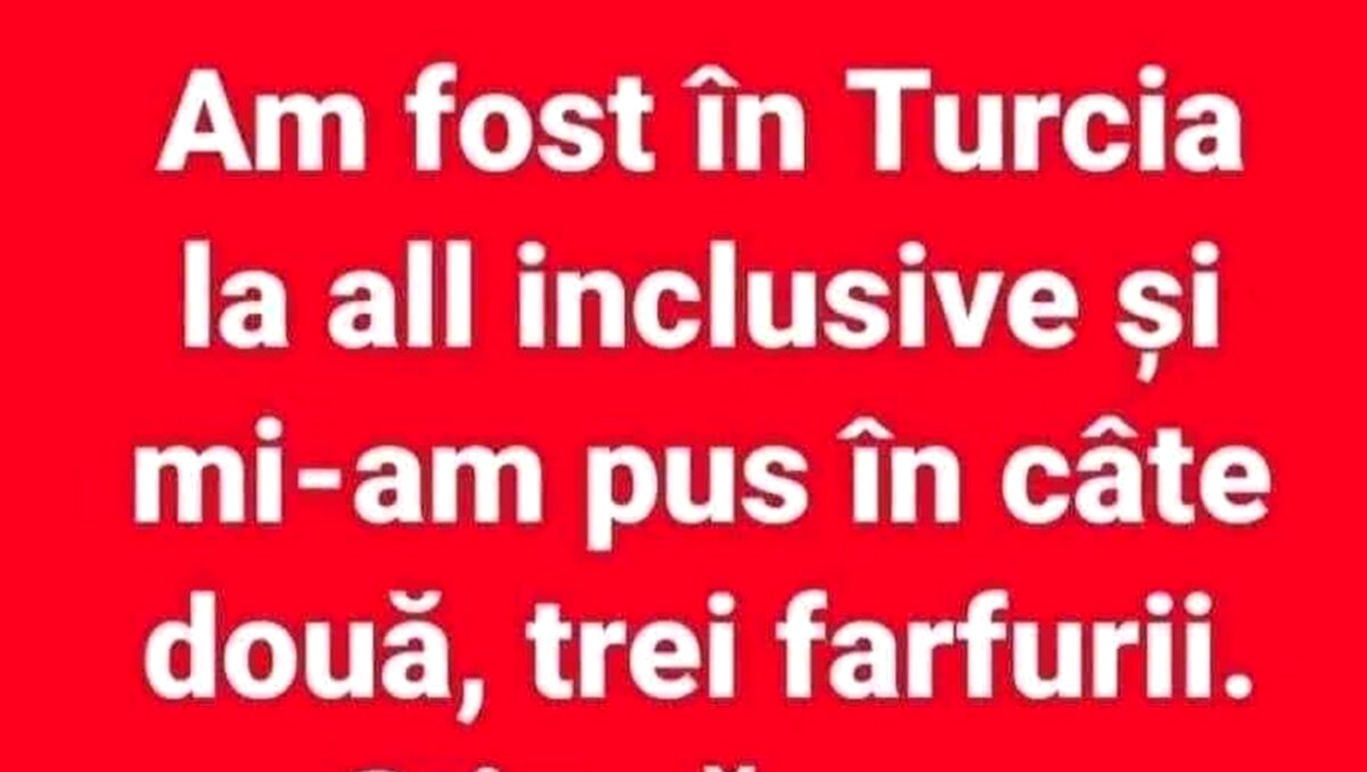 Ajunşi la scurtă distanţă de incipitul weekendului, CANCAN.RO ţi-a pregătit un banc perfect pentru a dobândi o bună stare de spirit şi a încheia ziua cu un zâmbet. Află de ce își umple cu adevărat românii farfuriile la all-inclusive în Turcia.