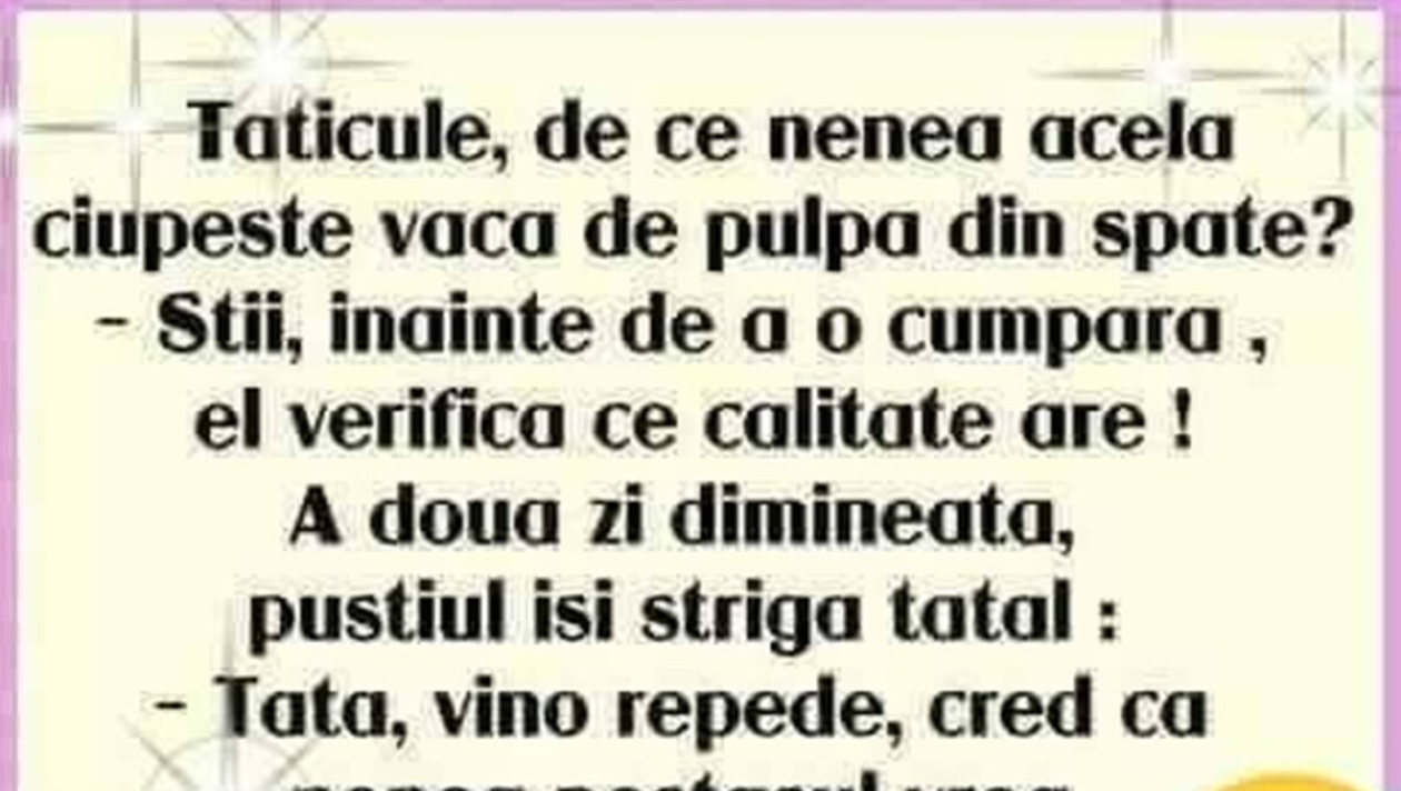 Dacă vrei să ai parte de o zi plină de râsete și voie bună, atunci iată un banc amuzant ce-ți va aduce zâmbetul pe buze. Așadar, CANCAN.RO vă prezintă o glumă cu adevărat bună.
