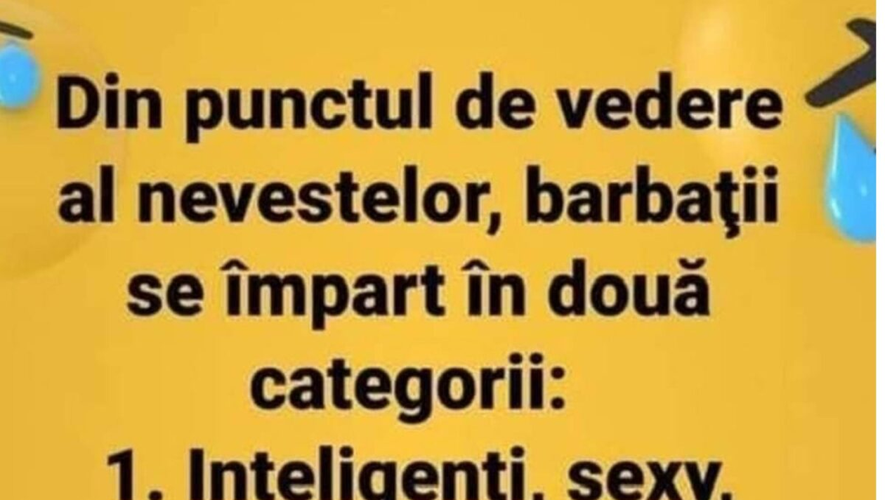 Dragă cititorule, CANCAN.RO ți-a pregătit un banc de nota 10. Ești pregătit să râzi cum nu ai mai făcut-o de mult timp? Din punctul de vedere al nevestelor, află care sunt cele două categorii în care se împart bărbații.