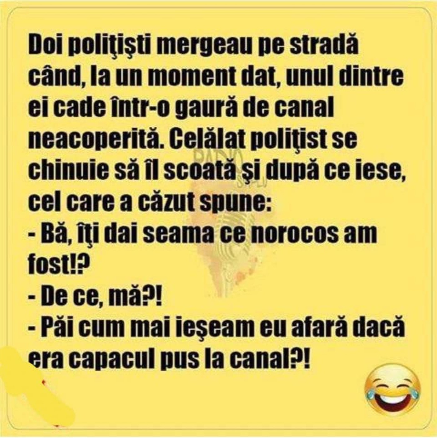 „Doi polițiști mergeau pe stradă când, la un moment dat, unul dintre ei cade într-o gaură de canal neacoperită. Celălalt polițist se chinuie să îl scoată și, după ce iese, cel care a căzut spune: