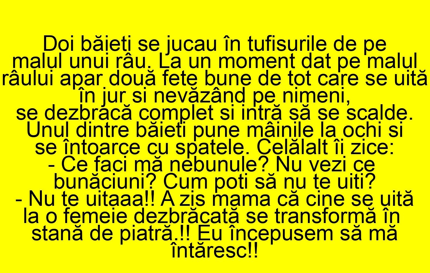 -Nu te uitaa!! A zis mama că cine se uită la o femeie dezbrăcată se transformă în stană de piatră!! Eu începusem să mă întăresc!!