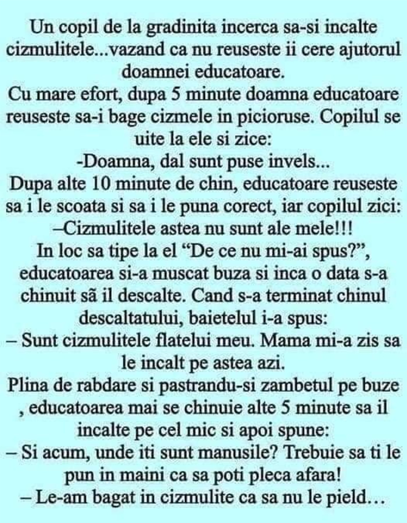 Un copil de la grădiniță încearcă să-și încalțe cizmulițele… văzând că nu reușește îi cere ajutorul doamnei educatoare. Cu mare efort, după 5 minute doamna educatoare reușește să-i bage cizmele în piciorușe. Copilul se uită la ele și zice: