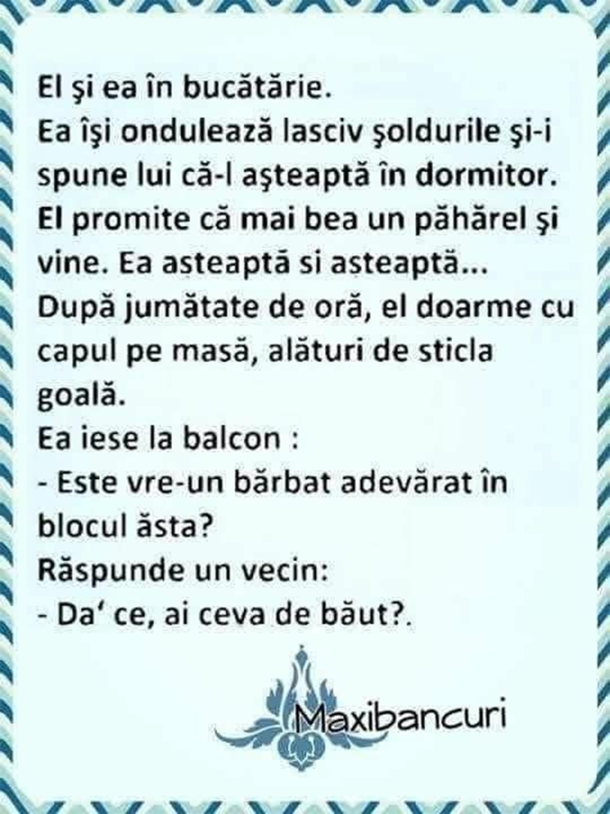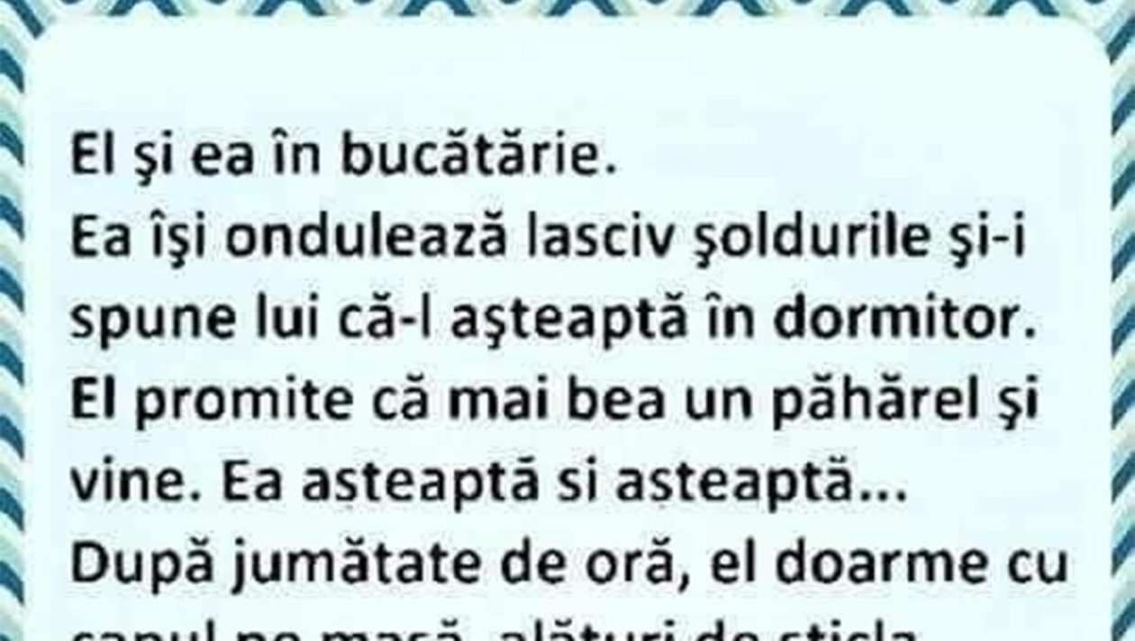 Bancul zilei. O femeie și partenerul ei se află în bucătărie. Ea îi spune că merge în dormitor și-l așteaptă. El promite că vine în cameră, după ce mai savurează un pahar cu băutură. Reacția femeii când vede că bărbatul nu o urmează în dormitor stârnește amuzamentul!