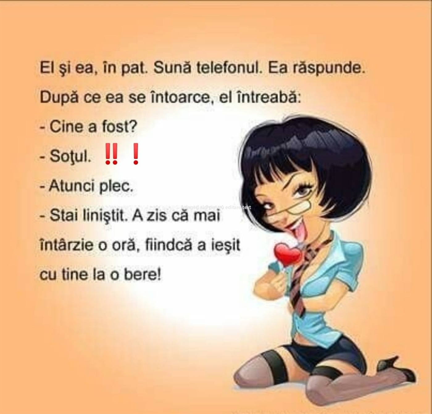 -Stai liniștit. A zis că mai întârzie o oră, fiindcă a ieșit cu tine la o bere!”