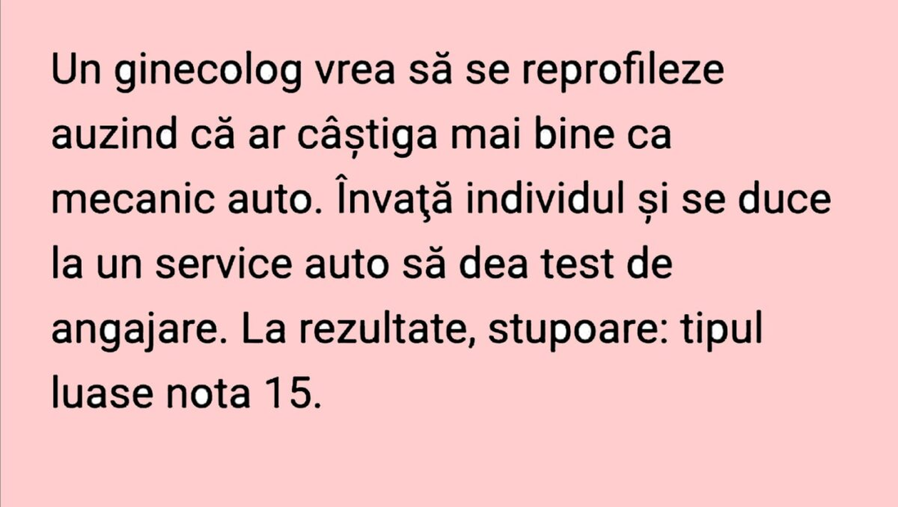 „Un ginecolog vrea să se reprofileze auzind că ar câștiga mai bine ca mecanic auto. Învață individul și se duce la un service auto să dea test de angajare. La rezultate, stupoare: tipul luase nota 15.