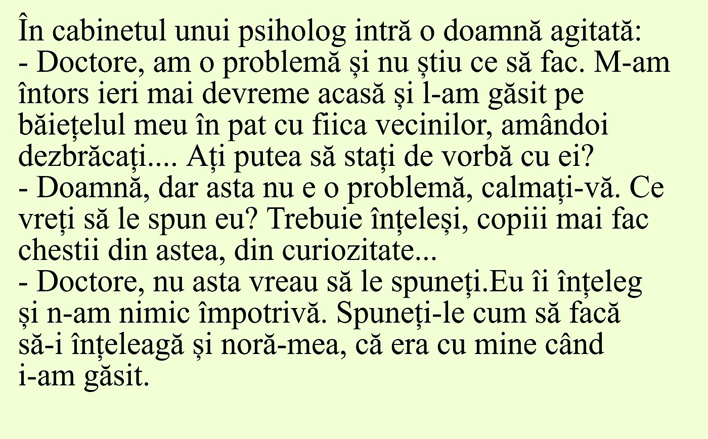 -Doctore, am o problemă și nu știu ce să fac. M-am întors ieri mai devreme acasă și l-am găsit pe băiețelul meu în pat cu fiica vecinilor, amândoi dezbrăcați… Ați putea să stați de vorbă cu ei?