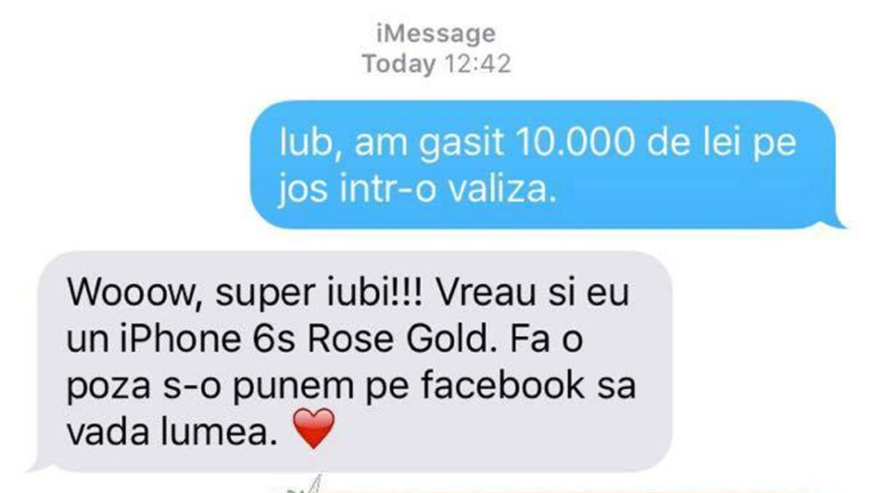 – Iub, am găsit 10.000 de lei pe jos, într-o valiză.