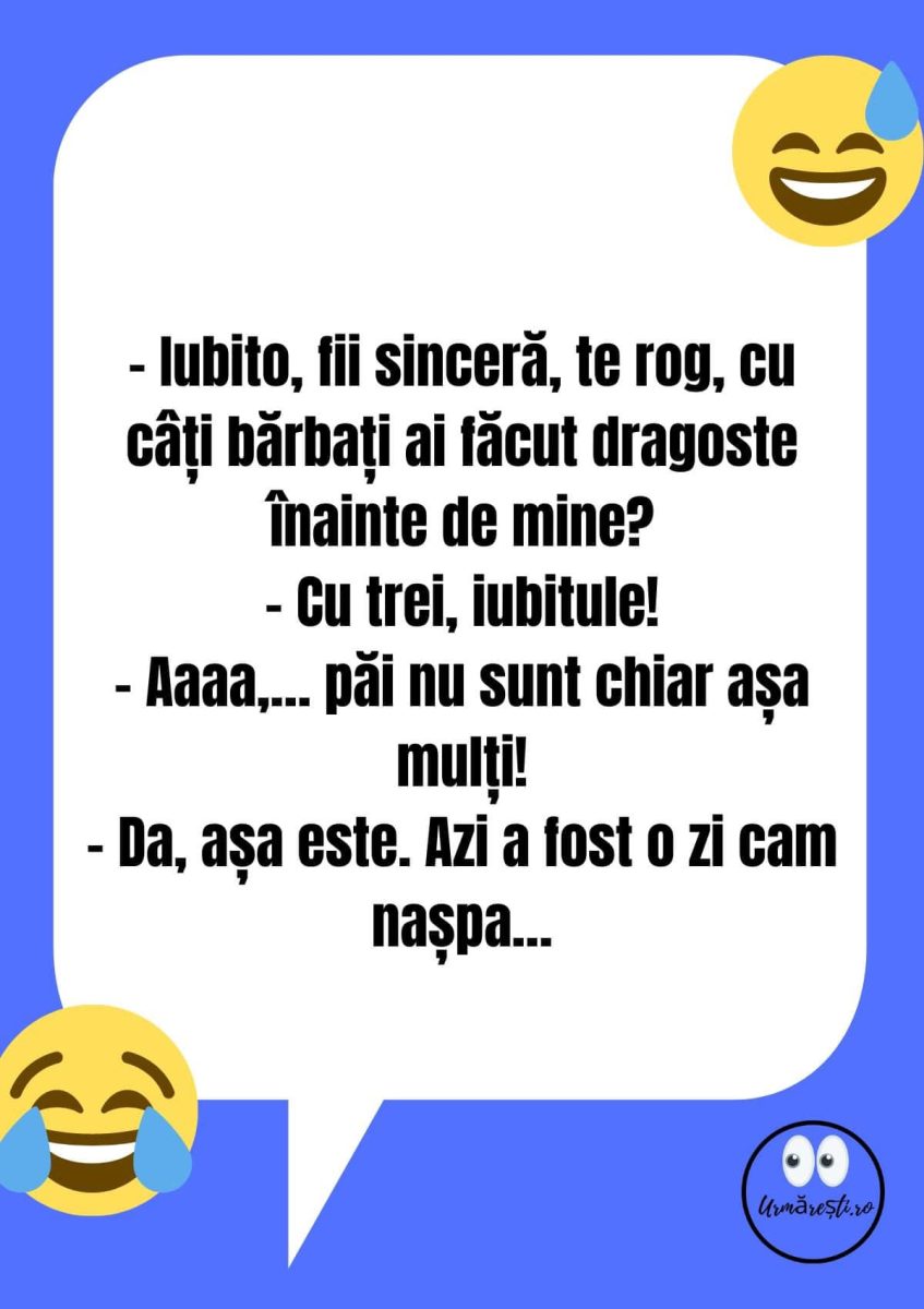 – Iubito, fii sinceră, te rog. Cu câți bărbați ai făcut dragoste înainte de mine?
