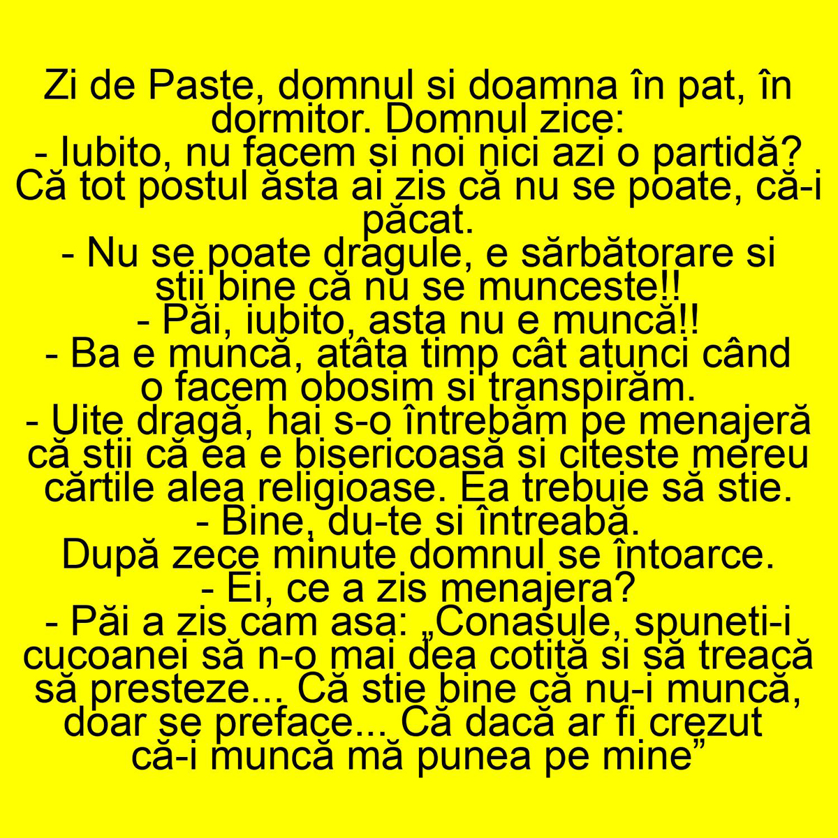 Bancul zilei spune „povestea” unui bărbat care vrea să facă amor cu soția sa, în ziua de Paște. După lungul post în care l-a refuzat, încearcă și de data aceasta, dar este refuzat. Șoțul nu vrea să cedeze așa ușor și scoate asul din mânecă.