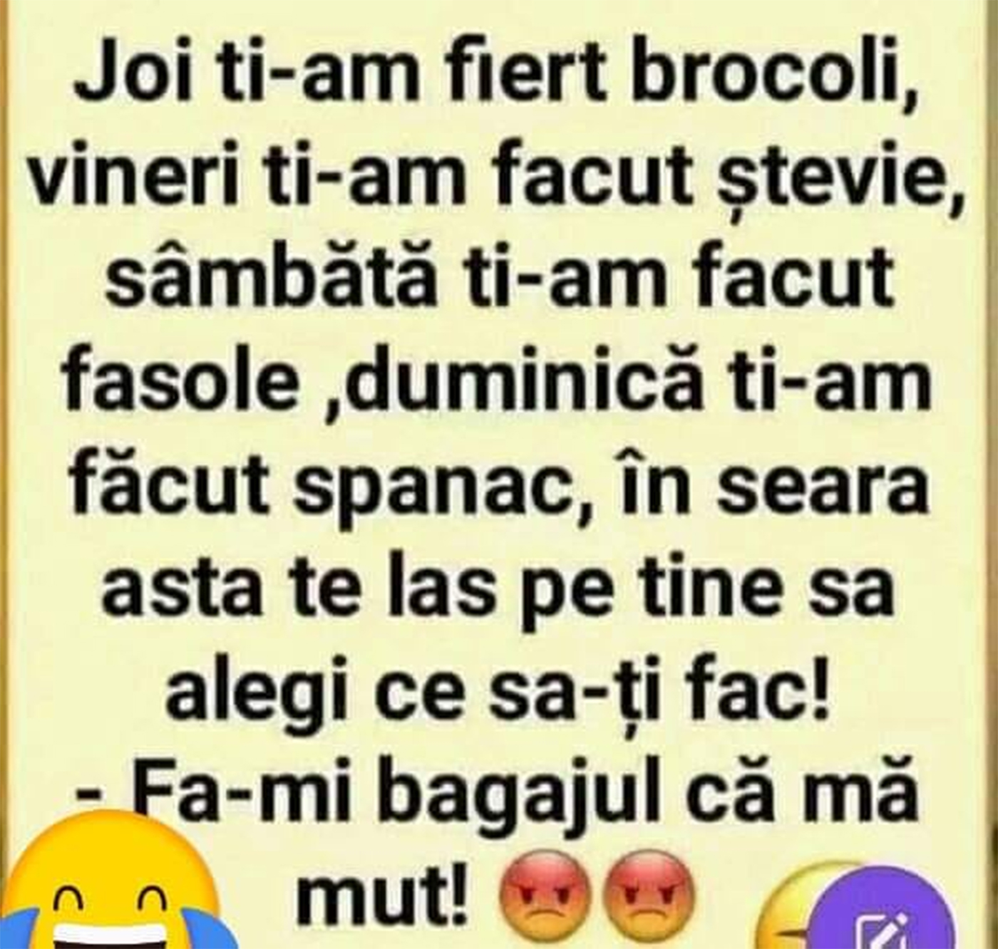 „Joi ți-am fiert broccoli, vineri ți-am făcut ștevie, sâmbătă și-am făcut fasole, duminică ți-am făcu spanac, în seara asta te las pe tine să alegi ce să-ți fac!